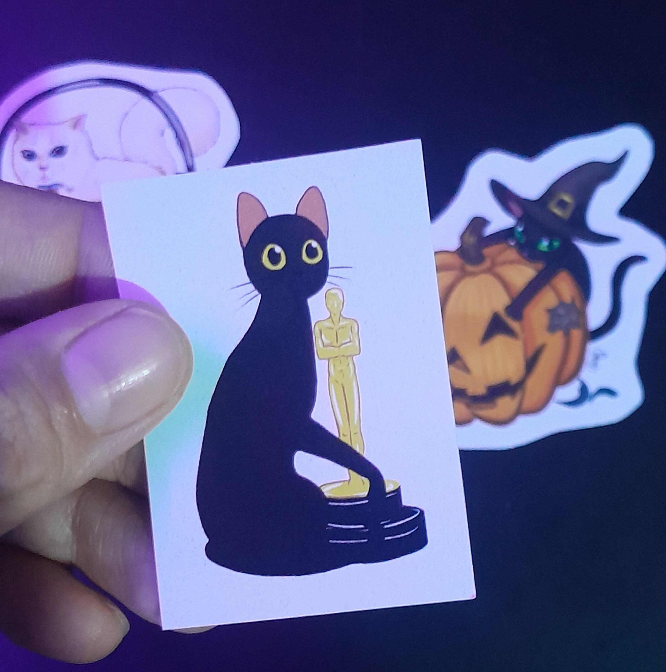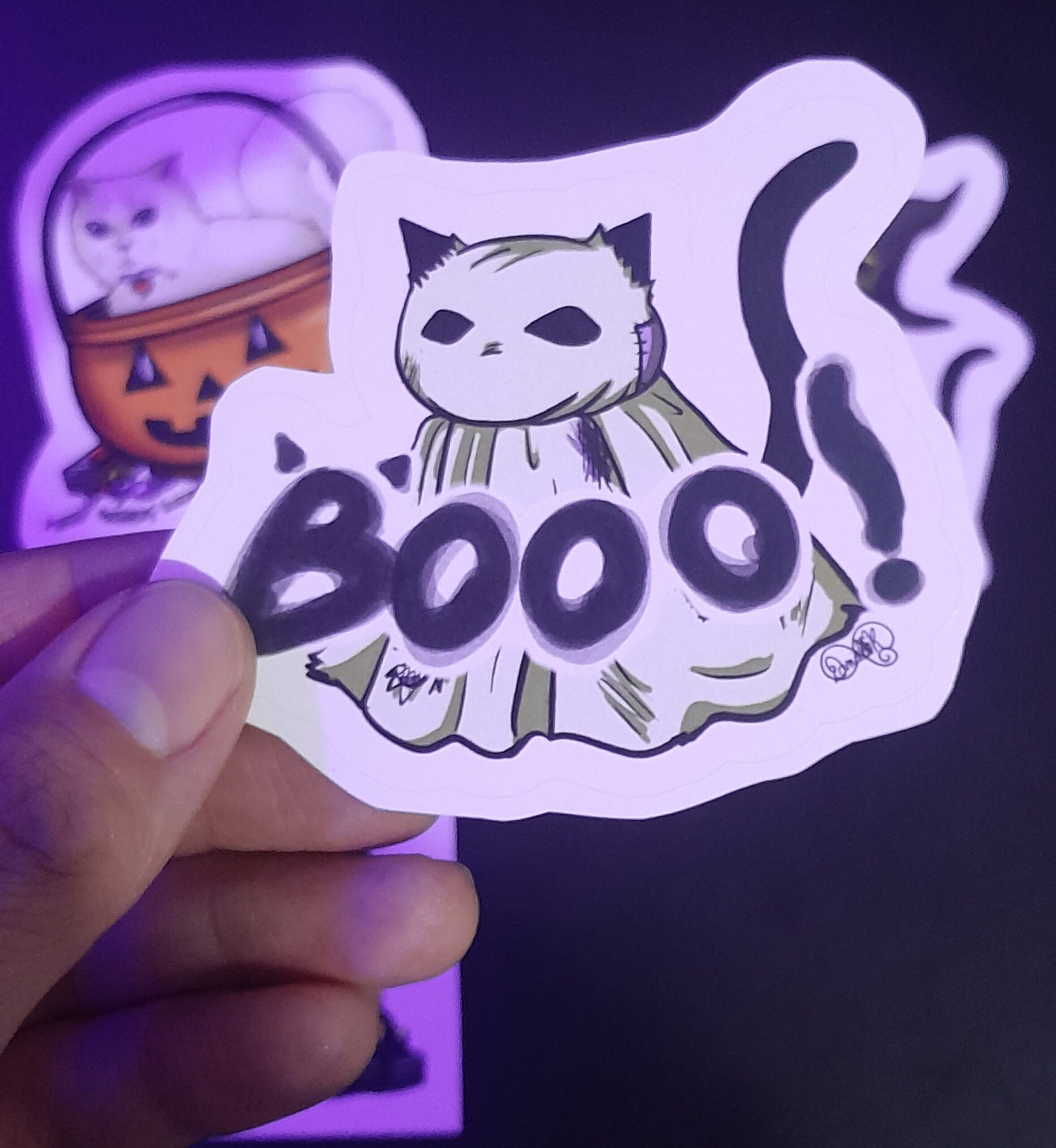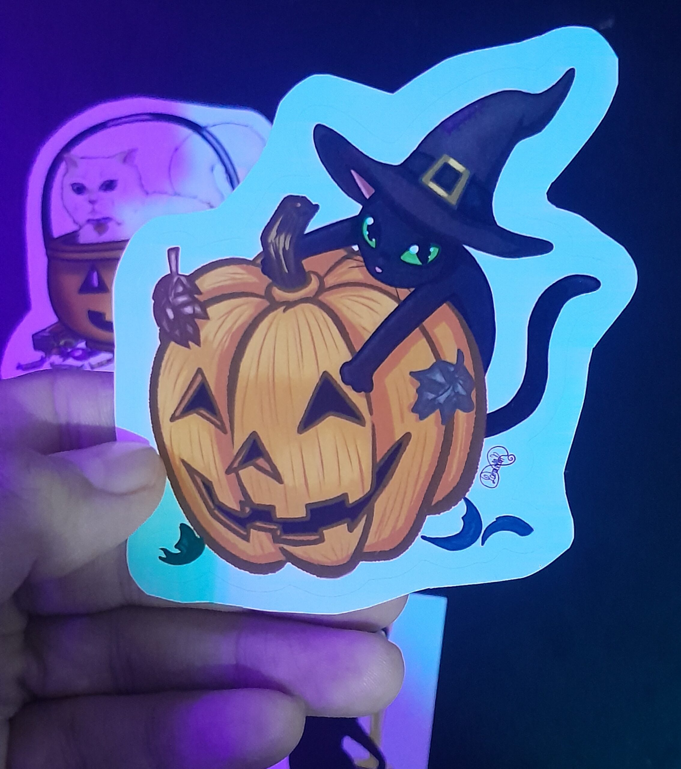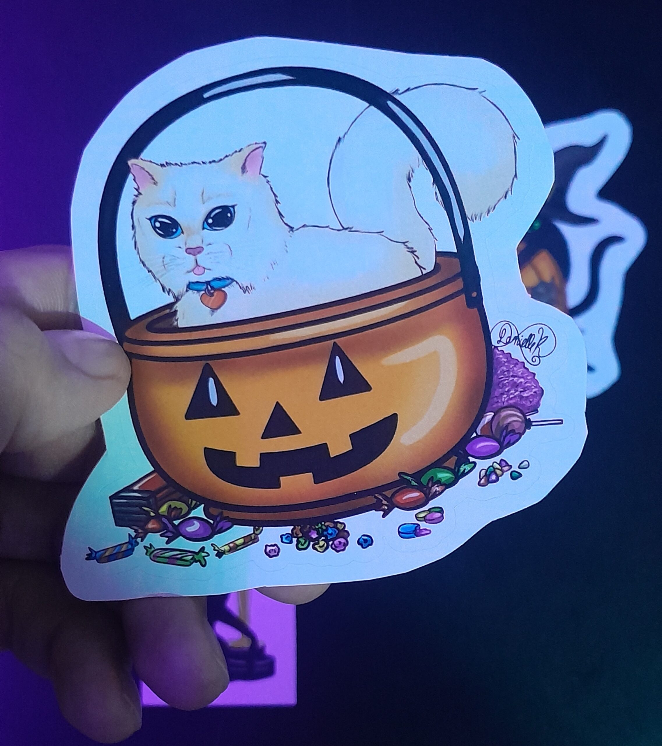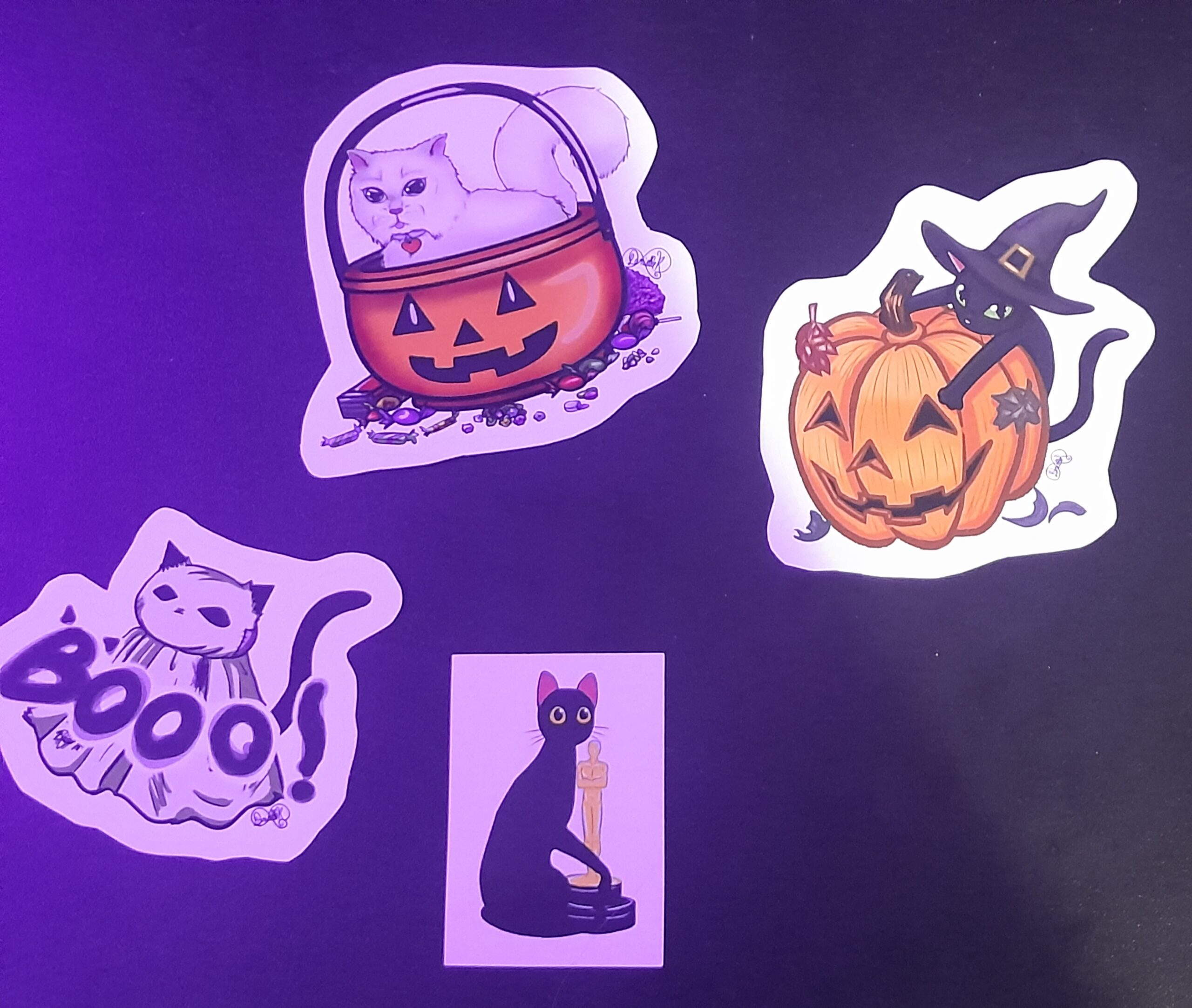 Set de 3 stickers + 1 sticker de regalo con temática Michi Halloween. Adhesivo común, acabado mate.